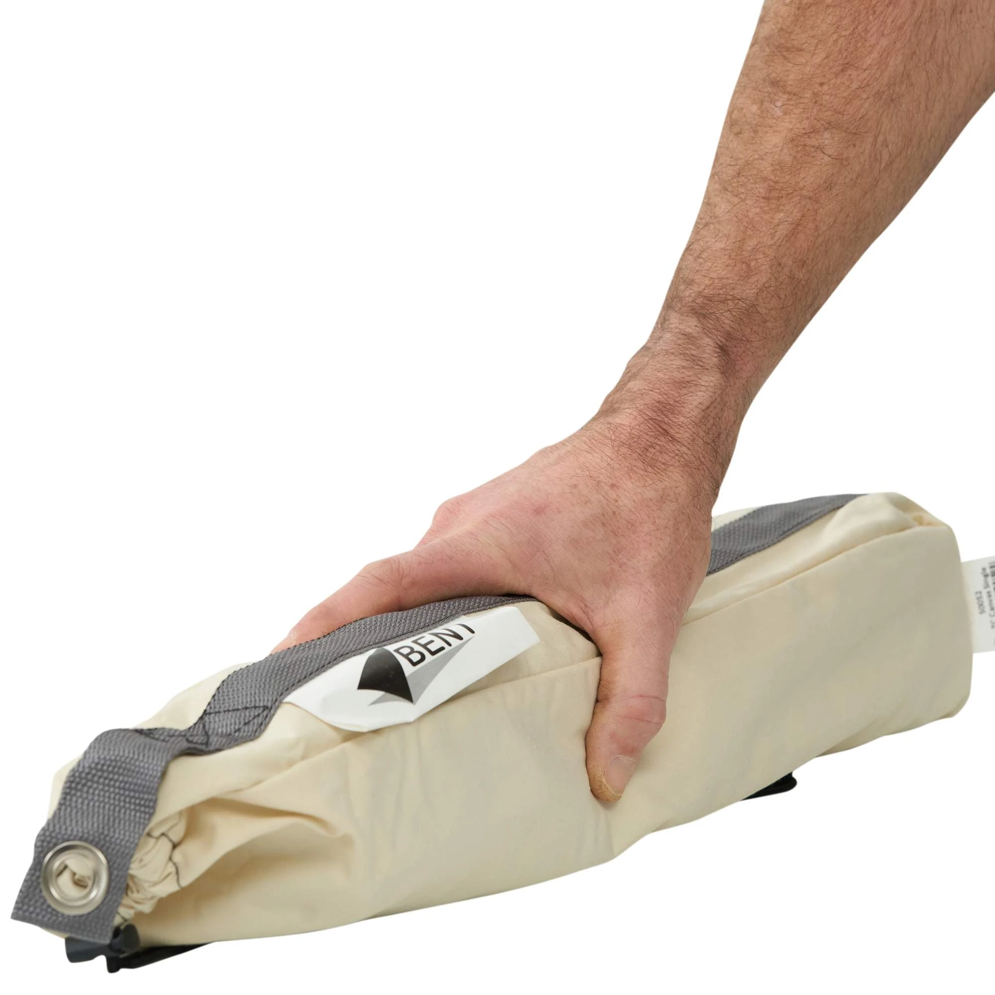 Jede Ecke des Tarps ist verstärkt und besitzt eine Metallöse, durch die du eine (separat erhältliche) Tarpstange stecken kannst. Mit den Abspannleinen wird das Tarp sicher an Bäumen oder am Boden fixiert. Damit stellt das Bent Tarp einen schönen Begleiter dar, der dich zu Festivals, zum Campen oder an den Strand begleitet.