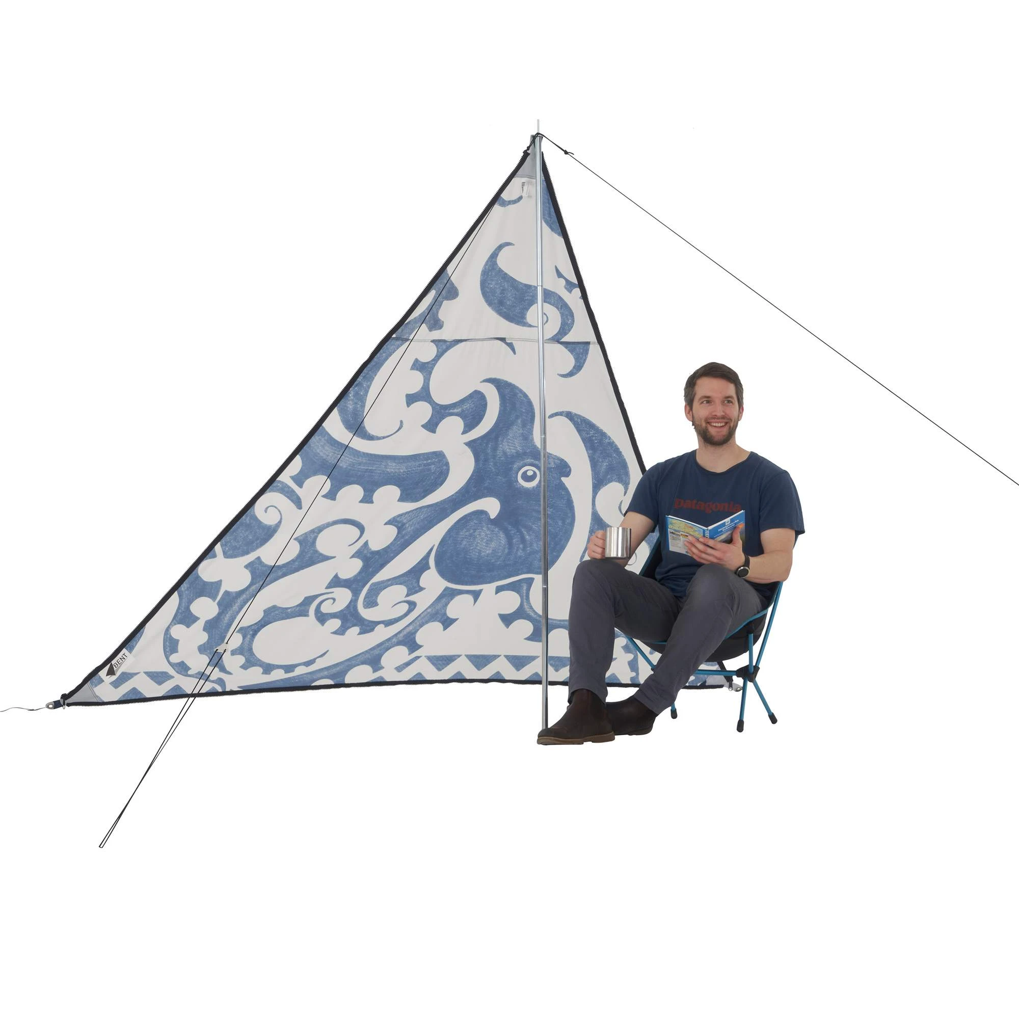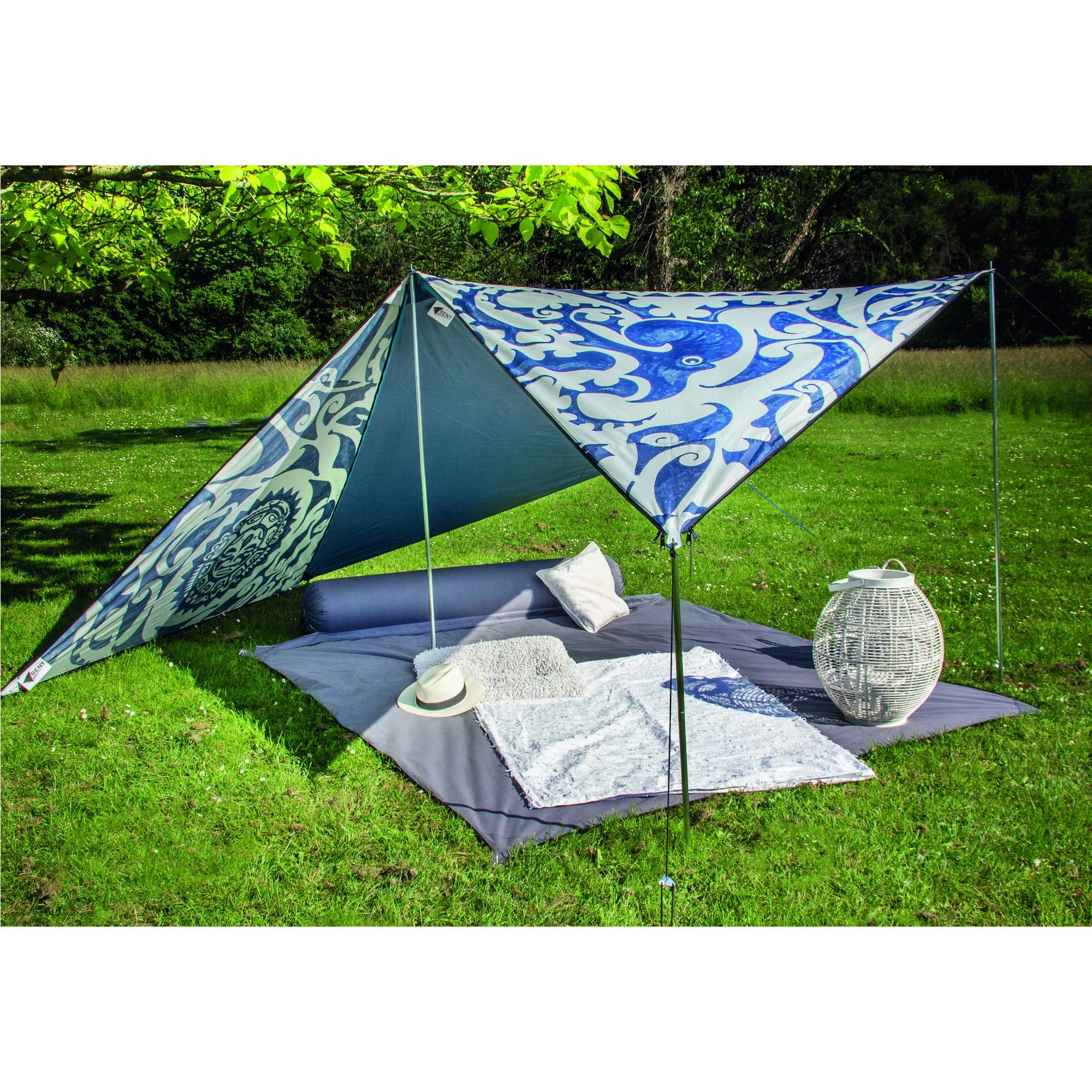 Jede Ecke des Tarps ist verstärkt und besitzt eine Metallöse, durch die du eine separat erhältliche Tarpstange stecken kannst. Mit den Abspannleinen wird das Tarp sicher an Bäumen oder am Boden fixiert. Damit stellt das Bent Tarp einen schönen Begleiter dar, der dich zu Festivals, zum Campen oder an den Strand begleitet.