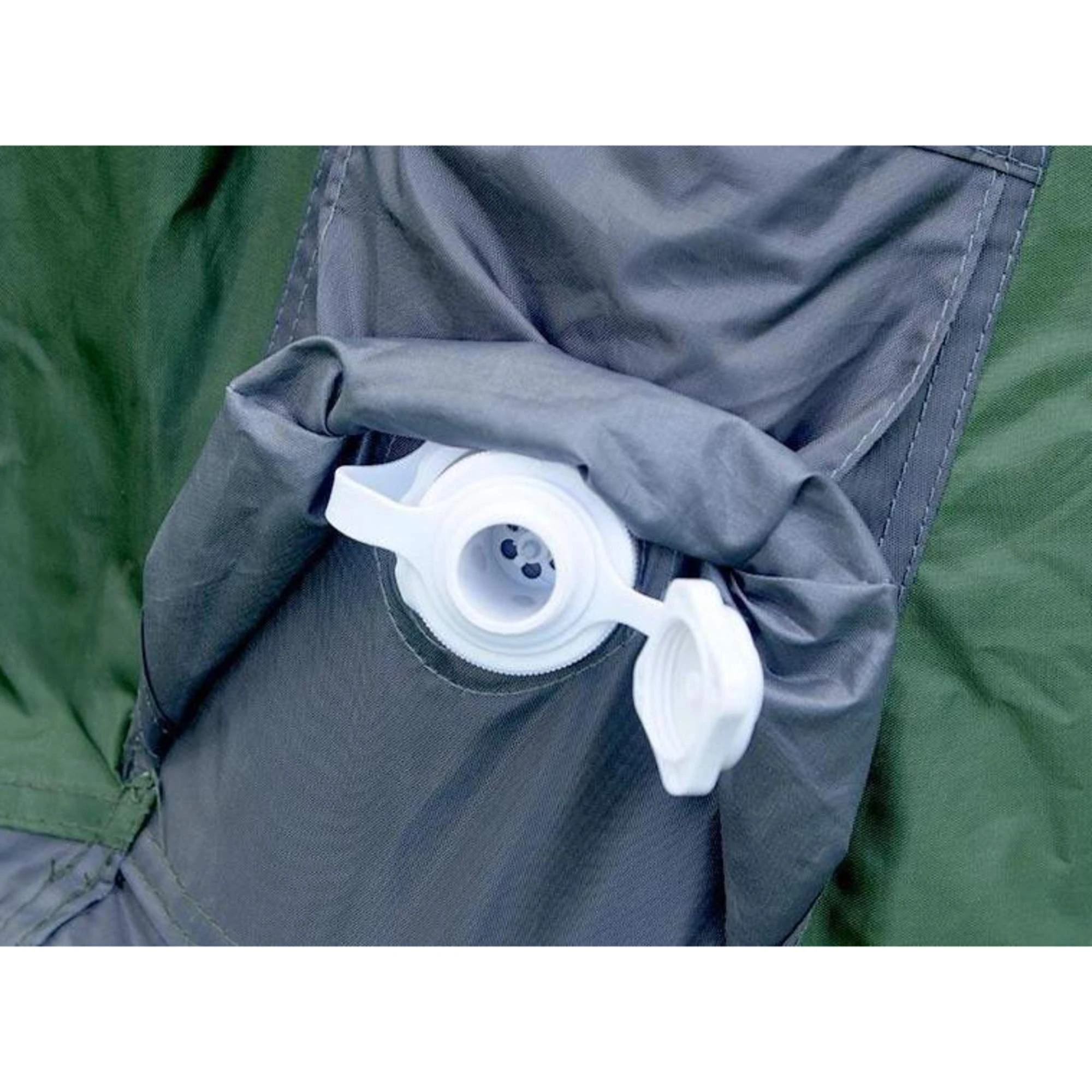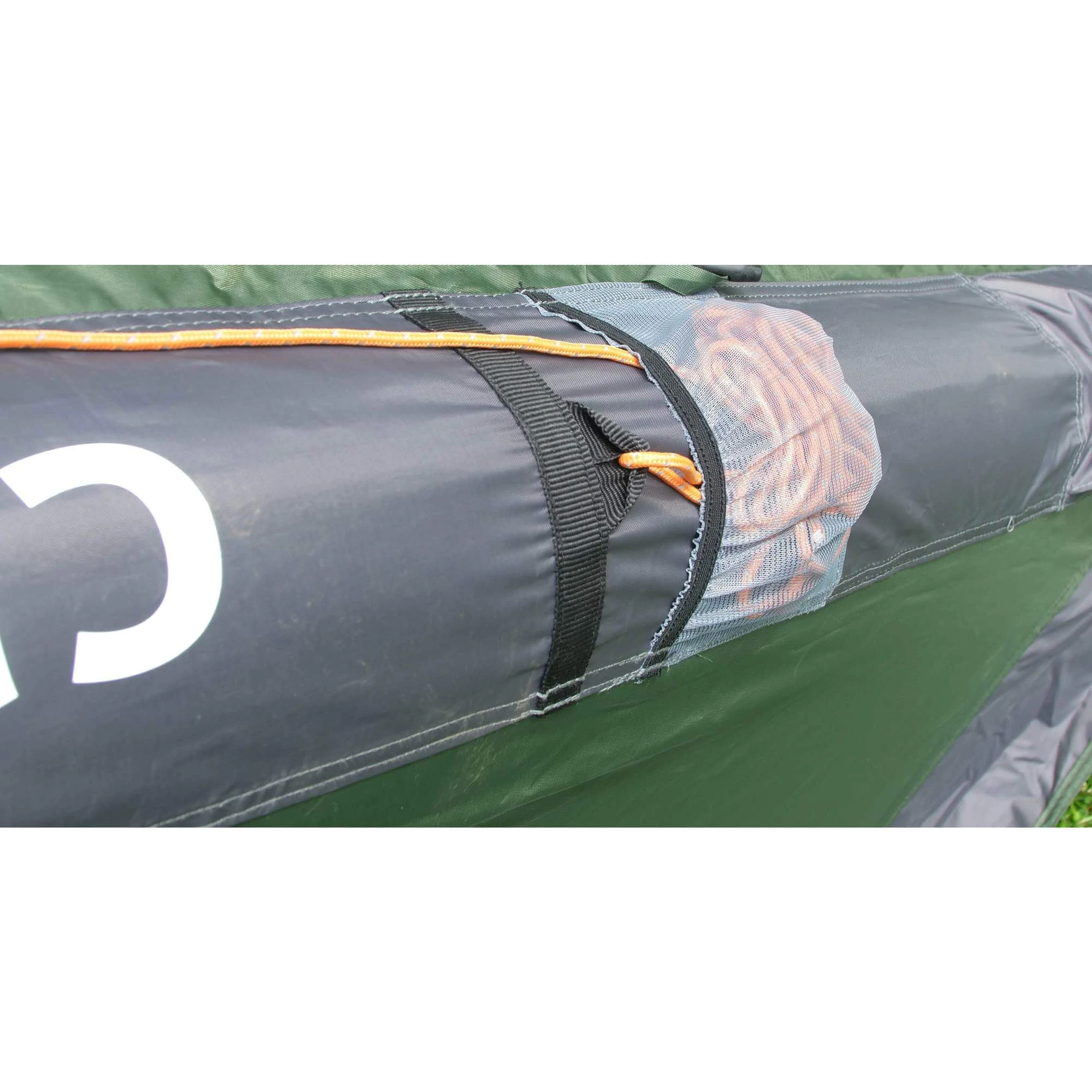 - Die Innenzelttür kann aufgerollt mit einem Knebelverschluss befestigt werden