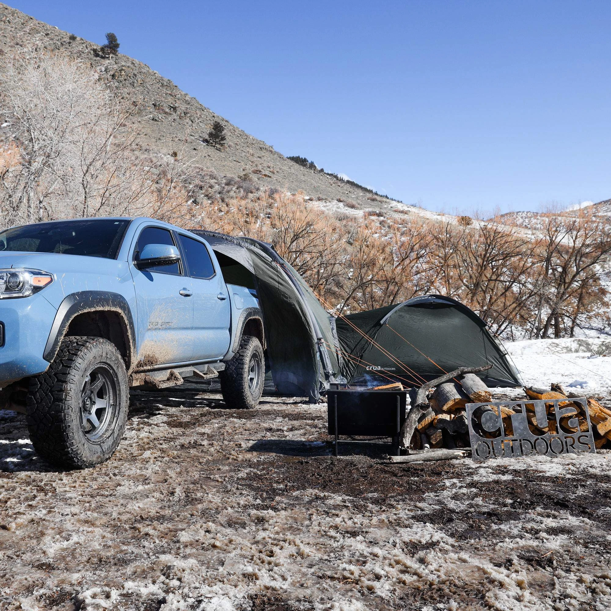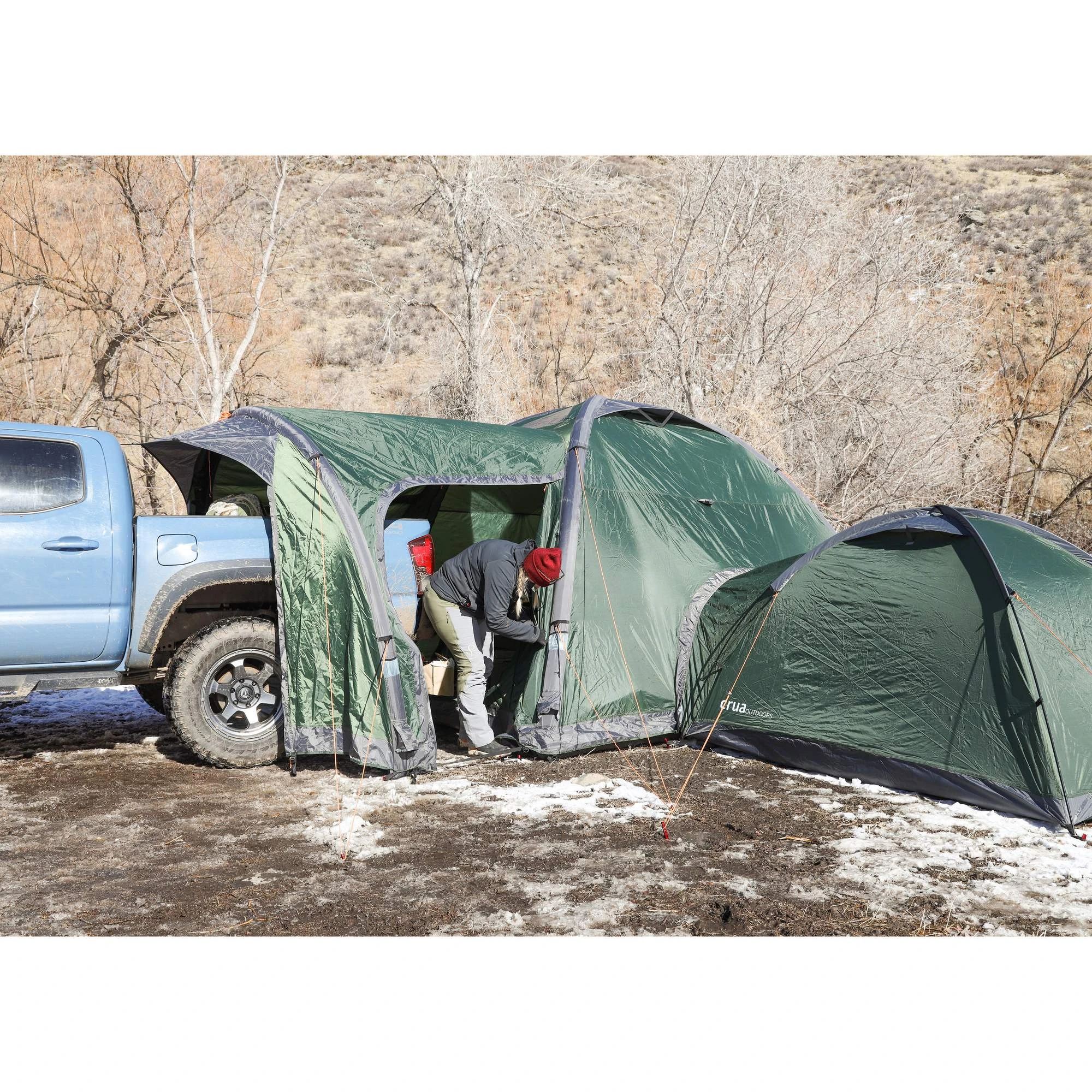 Die Stärken spielt das Zelt aber erst mit seinen kleinen Geschwistern, dem Crua Duo und Crua Duo Maxx aus. Sie können an den kleinen Nebeneingängen angedockt werden und dienen als Schlafkabine. So bleibt der große Raum des Cores frei und kann als Wohnzimmer mit Tisch, Stühlen, Fahrrädern und anderen Dingen bestückt werden. In der Apside können dann Schuhe oder die Outdoorküche untergestellt werden.