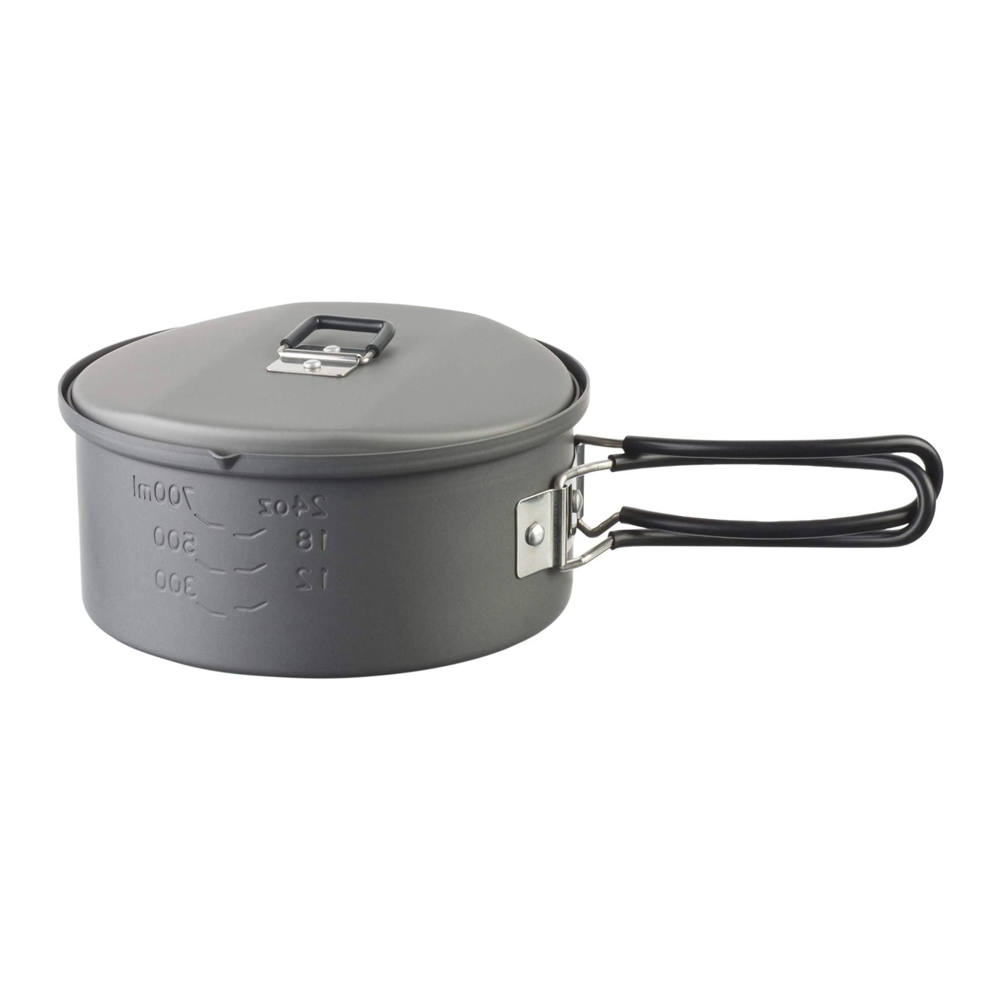 Leichter Aluminiumtopf mit 1100 ml Volumen, den du dank seiner Klappgriffe platzsparend im Gepäck verstauen kannst. Eine Volumenskala im Innern hilft dir beim Abschätzen von Wassermengen.