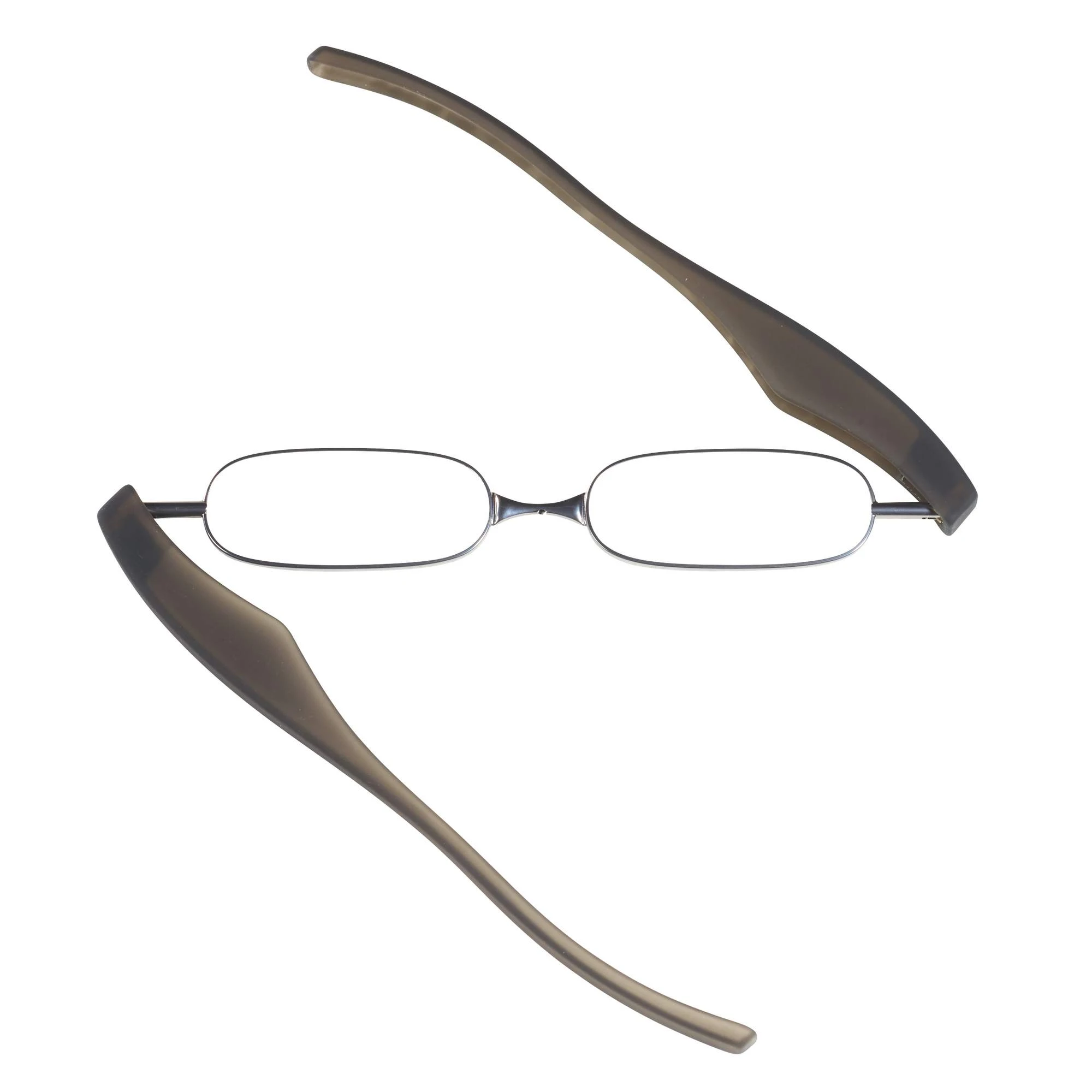 Praktische, kleine Lesebrille für Reisen. Die Bügel können um 90 Grad gedreht werden und dienen anschließend als Etui. Die Brille nimmt so nicht viel mehr Platz als ein Stift ein.