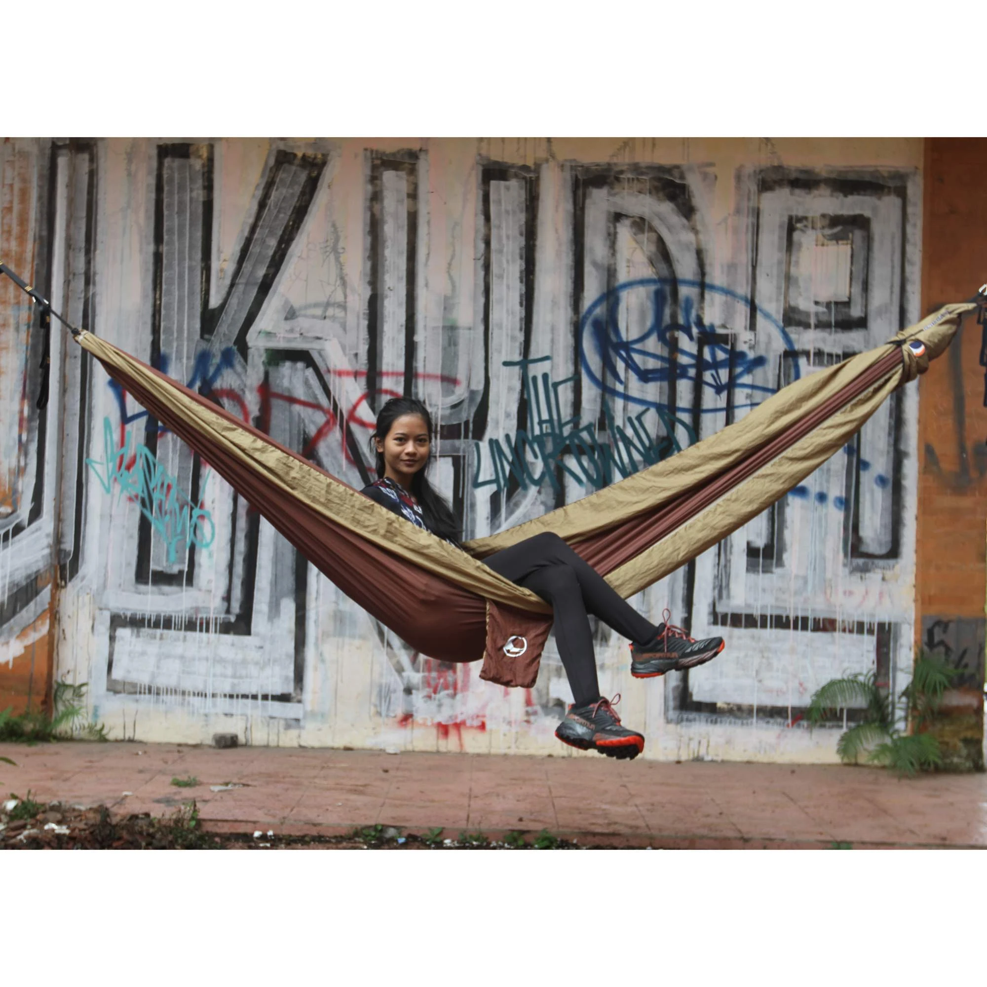 Farbenfrohe Hängematte, ganze zwei Meter breit und mit viel Tragkraft. Darin lassen sich auch ganze Nächte problemlos und angenehm verbringen. Ein gemütliches Stück Outdoor, das dich lange begleitet!